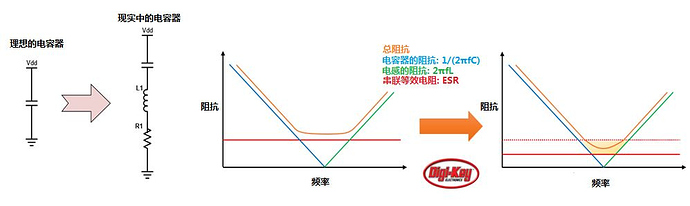 我们可以看到电容的总阻抗随着频率变化而变化。开始时,电容器提供的阻抗占据主要地位。随着频率的增加, 在某一个频率发生谐振。这时整个电容的阻抗约等于ESR并且整个电容的阻抗最小。所以ESR决定了电容在某一频率范围内最低的阻抗。尤其是对一些滤波应用,低ESR的电容往往有更好的表现。